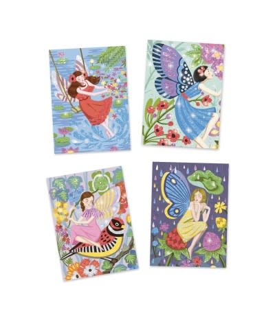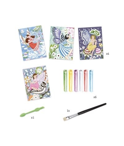 4 afbeeldingen met charmante feeën die je met kleurrijke glitter kunt versieren. De kinderen leggen de tekening in de doos, maken de voorgelijmde vlakken open met het meegeleverde gereedschap en bestrooien ze vervolgens met glitterpoeder volgens de kleurcode in het boekje. De feeën schitteren!
