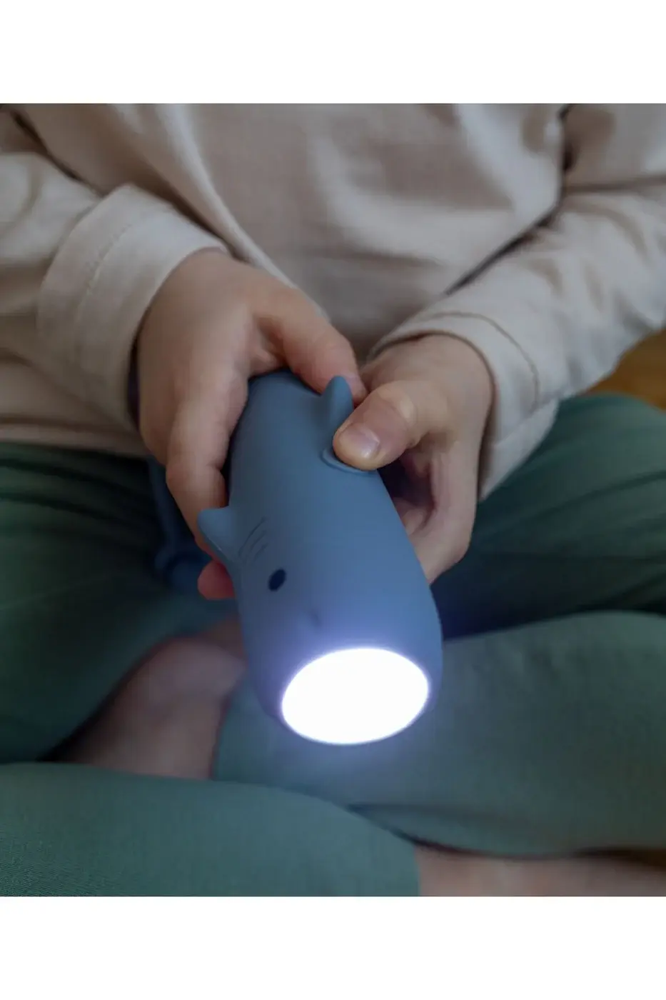 Haaien-vormige zaklamp, bedekt met zacht siliconen, is de perfecte combinatie van functionaliteit en plezier. Dankzij de handige helderheidsregeling is hij ideaal voor avondavonturen, schaduwspel of verhaaltjes voor het slapengaan. Oplaadbaar via een USB-C-kabel, biedt hij comfort en lange gebruiksuren. De hanger maakt het eenvoudig om de zaklamp op te hangen.