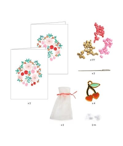 Een assortiment van kralen en kersenbedeltjes in een mooi glanzend doosje om 2 armbanden met zomerse kleuren te maken. 2 sieraden om te bewaren of cadeau te doen in een zakje van organza. En voor nog meer herinneringen zijn er twee geïllustreerde kaarten bijgevoegd om lieve berichtjes op te schrijven.